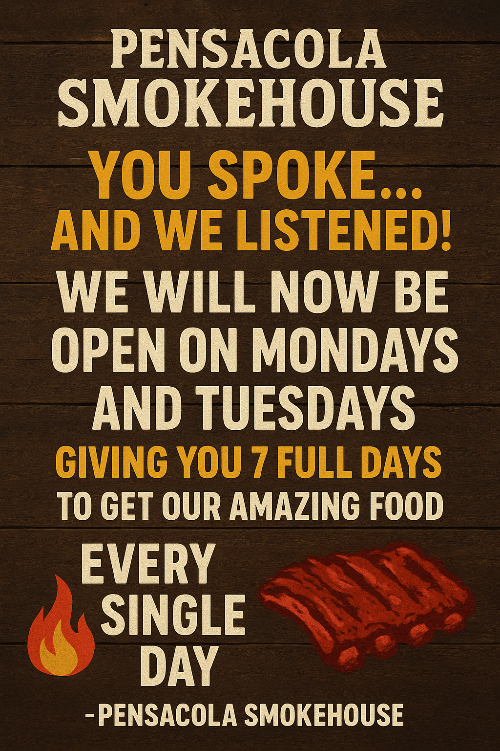 You can now enjoy Pensacola Smokehouse 7 days a week!